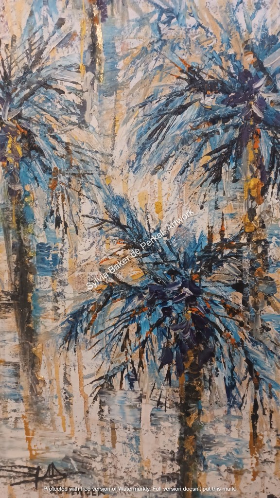 Acrylics + gold pigment + gold leaf + gesso on canvas. 70 cm x 90 cm. For price please visit https://www.saatchiart.com/art/Painting-PALMS-IN-WINTER/1855591/8819624/view.