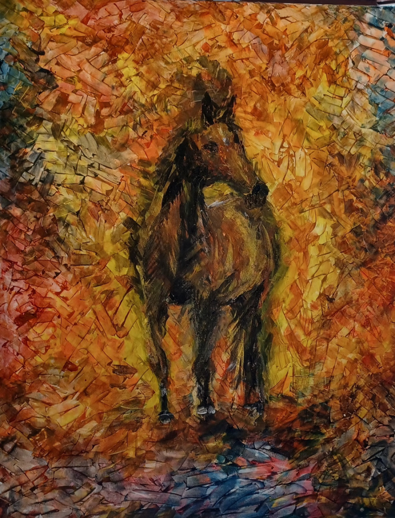 HORSE IN AUTUMN Posted bysylviabakerdeperkal16 September, 2025Posted inSin categoría Acrylics on canvas 120 cm x 160 cm Compártelo: Share on X (Opens in new window) X Share on Facebook (Opens in new window) Facebook Like Loading... Related