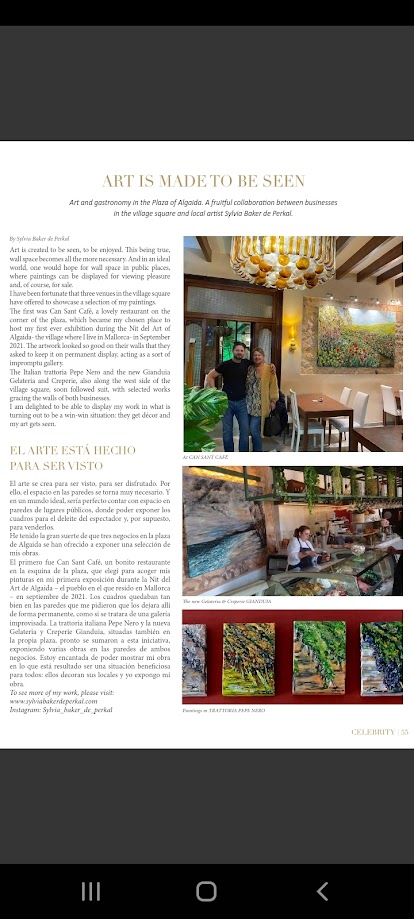 This is an article published in CELEBRITY MAGAZINE MALLORCA which truly summarises how I feel about having the privilege of dedicating much of my time at this stage of my life to art.