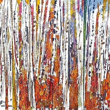 Flores, frutos y formas vegetales se transforman en composiciones donde la pintura y el collage se entrelazan para captar la vitalidad y la riqueza del mundo natural.