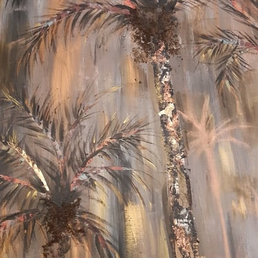 La obra fue desarrollada a partir de un fondo en tonos siena tostado, gris oscuro y cobre en degradé, en relación con los textiles del salón. La composición representa palmeras, elegidas por su verticalidad, y fue resuelta en tonos oscuros, pan de oro y pintura dorada. Para los dátiles se incorporaron virutas de hierro oxidadas, aportando textura y un carácter orgánico al conjunto.