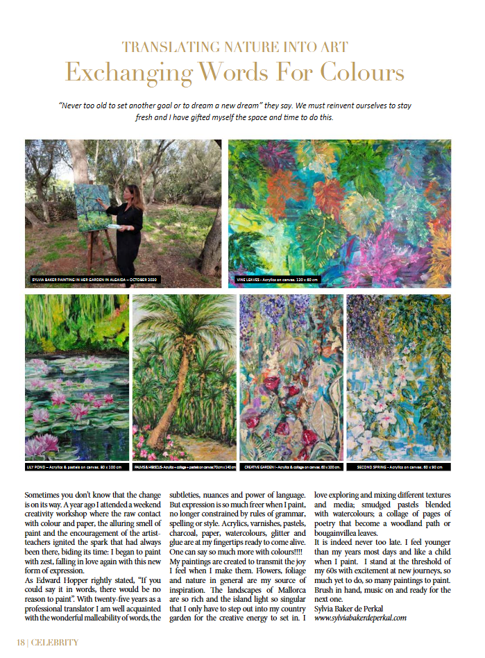 La obra de Sylvia Baker de Perkal ha sido recogida en distintas ocasiones por Celebrity Magazine Mallorca, a través de entrevistas y publicaciones que acercan su universo pictórico, su proceso creativo y su vínculo con la naturaleza.
